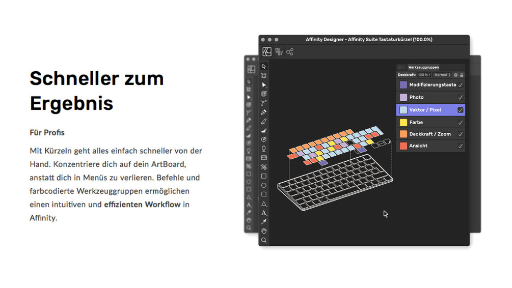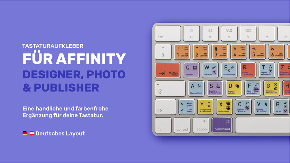 Tastaturaufkleber für Einsteiger und Experten, die Wert auf ein erstklassiges Tipperlebnis legen. Für Affinity Designer, Affinity Publisher und Affinity Photo.